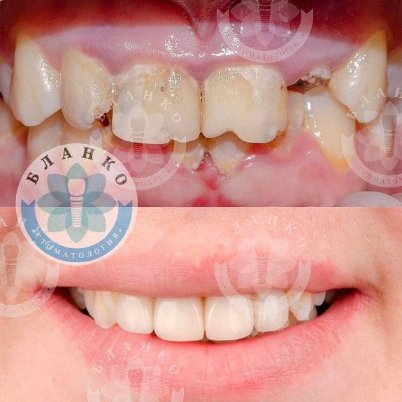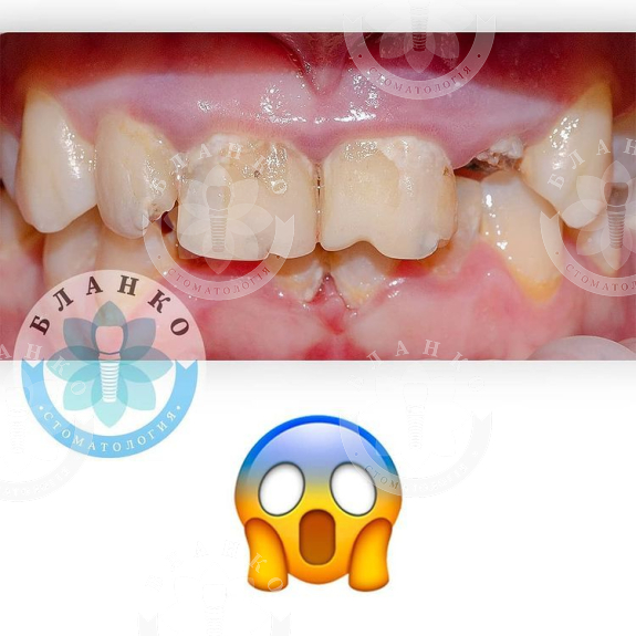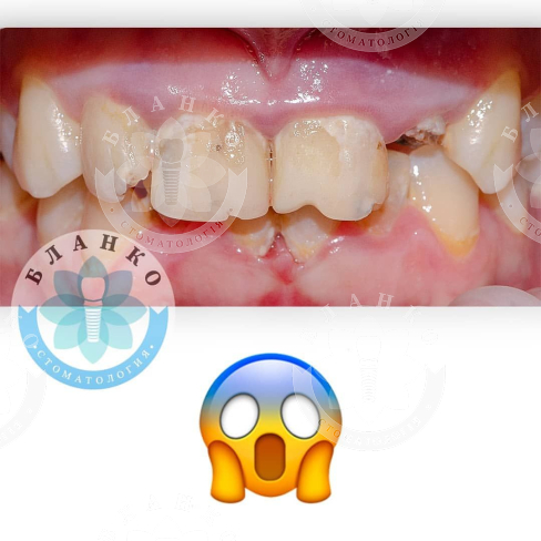Пациентка обратилась с множественными кариозными поражениями передних зубов.