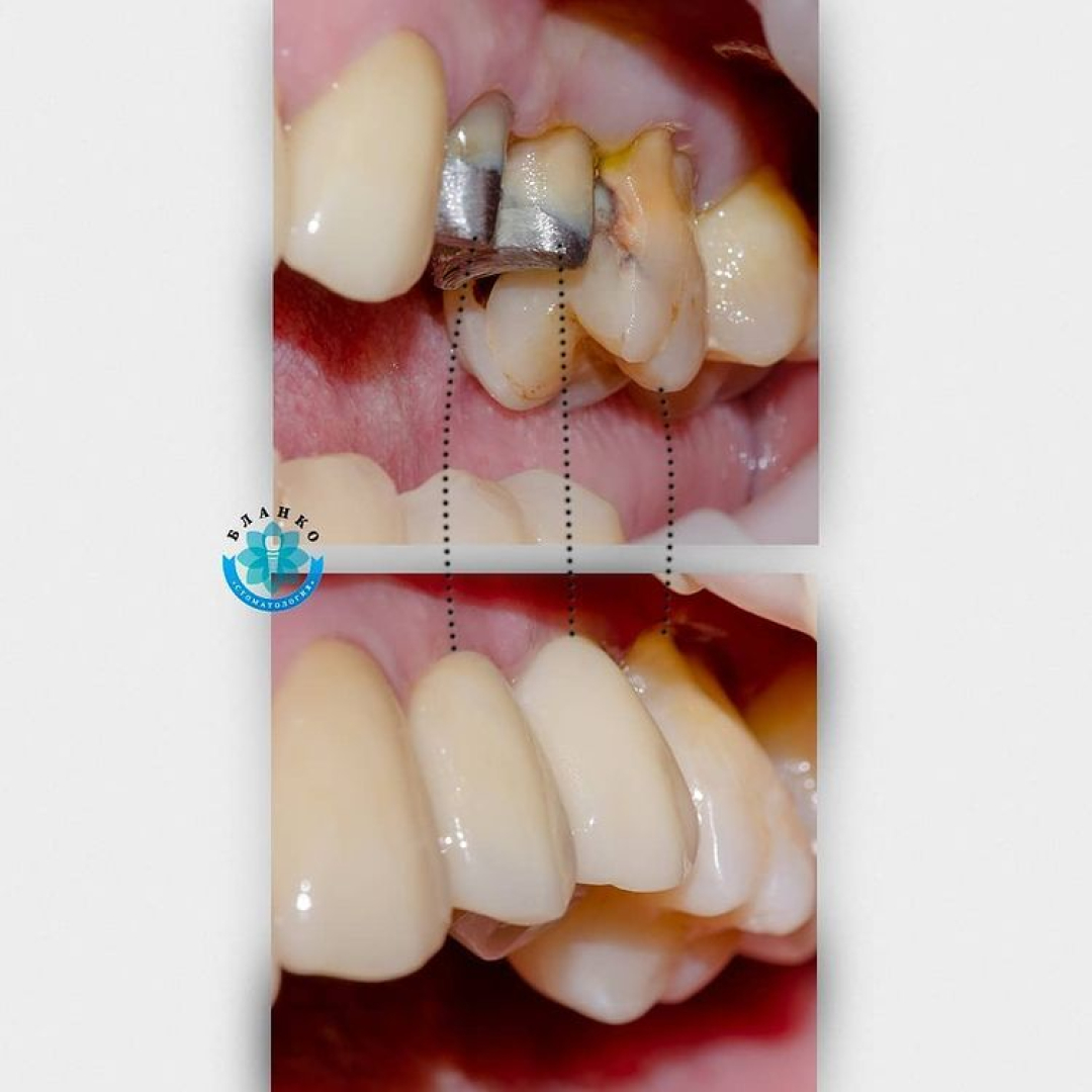 В данном клиническом случае два зуба восстановлены культевыми вкладками, изготовлены коронки из оксида циркония, третий зуб восстановлен с помощью прямой фотополимерной реставрации 😁👍