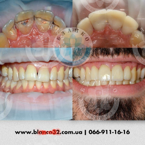 В анамнезе острая травма четырех передних зубов несколько лет назад. Зубы были шинированы ( соединены между собой ) с помощью специальной шины, в следствии чего у человека за несколько лет развилось хроническое воспаление десны и кариес. Вследствие травмы зубы потеряли свою форму, сместились. Задача лечения кариеса, восстановления формы и стабилизации десны решена с помощью четырёх реставраций из стеклокерамики 😀 🌞 🍏