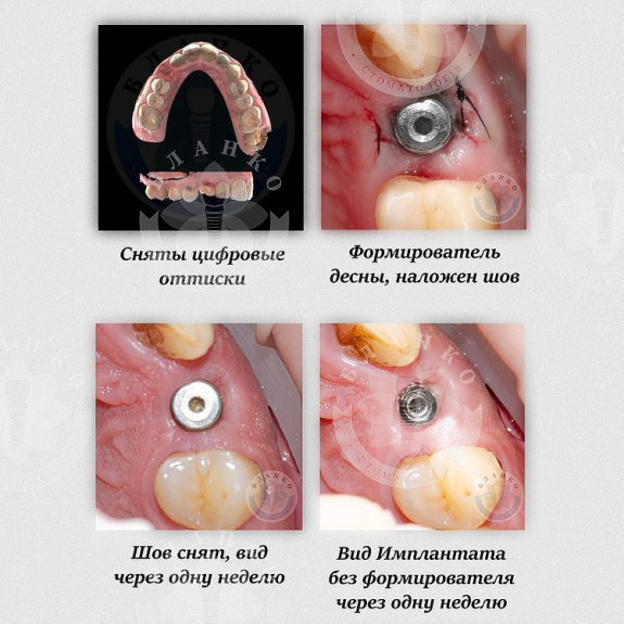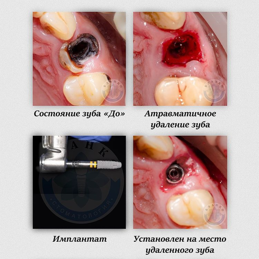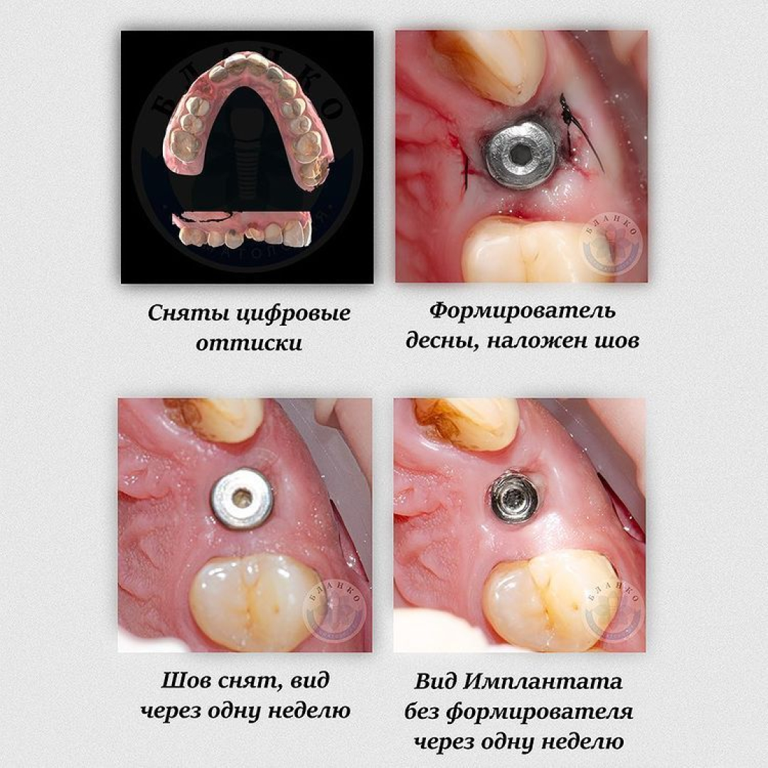 Было принято решение провести одномоментную Имплантацию, сразу же после удаления зуба в сочетании со специальной техникой менеджмента костной ткани. Сразу же после удаления скомпрометированного зуба установлен Имплантат, получены цифровые оттиски интраоральным сканером, изготовлена временная коронка, которая через неделю зафиксирована на место отсутствующего зуба.