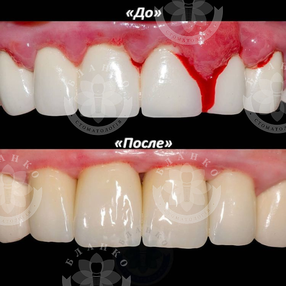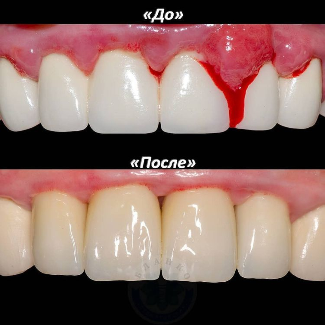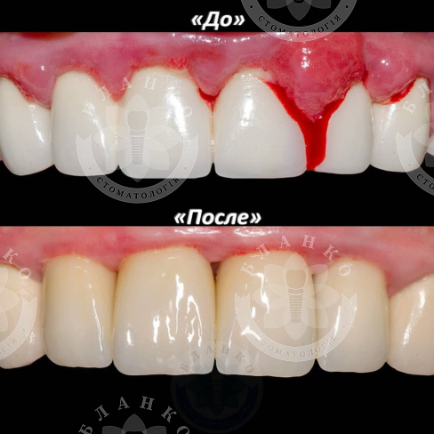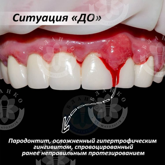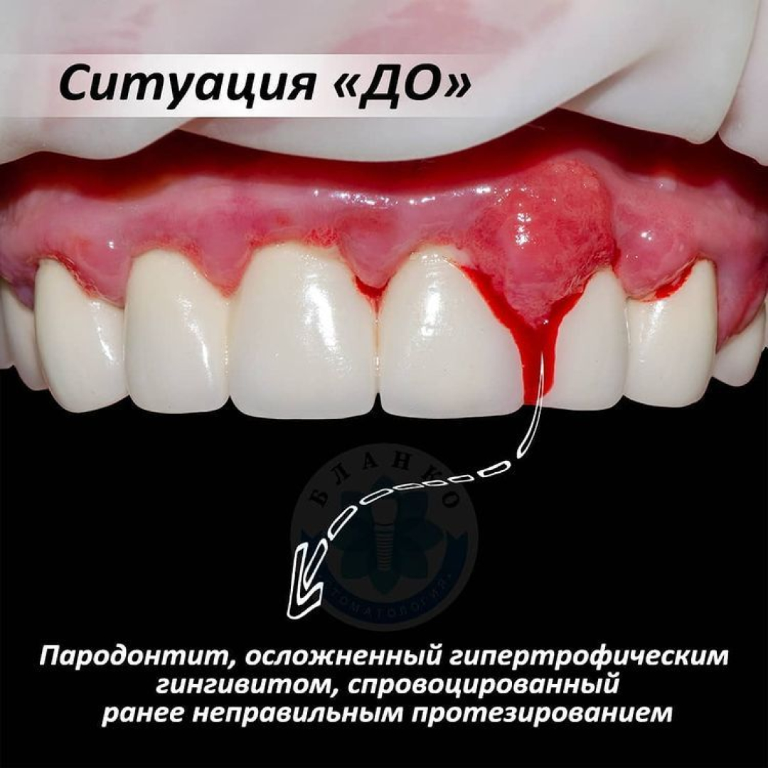 😷 Пациент обратился с пародонтитом, осложненным гипертрофическим гингивитом, спровоцированным ранее неправильным протезированием. На момент обращения состояние мягких тканей было крайне плохое, десна были воспалены, кровили, зубы имели подвижность.
