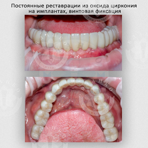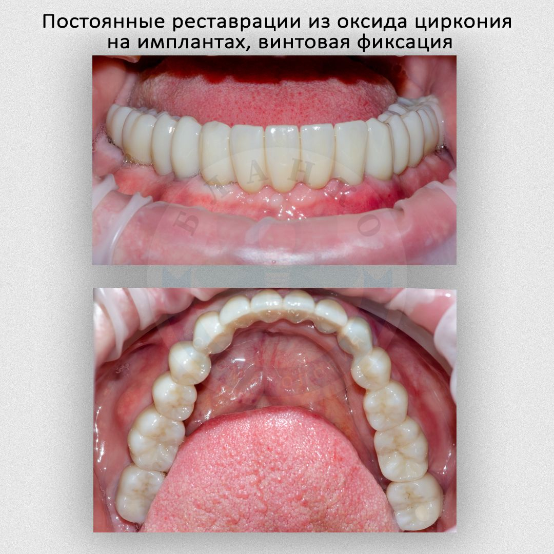 - Завершающий этап — фиксация постоянных реставраций из оксида циркония на имплантах, нижння челюсть.