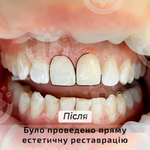 Посредством такой реставрации смогли визуально сделать зубы более ровными без необходимости применения ортодонтических аппаратов, с минимальным препарированием и с использованием современного фотополимерного материала ☝🏻